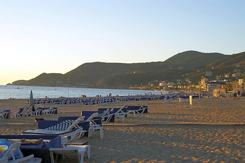 Rooms feature extra-long beds (> 6.5 ft) and baths, and many offer garden views from private balconies, adding a touch of calm to the lively beach scene. The property's seaside setting, proximity to the city center, and location in the Kleopatra area make it a practical base for exploring Alanya’s coastline.